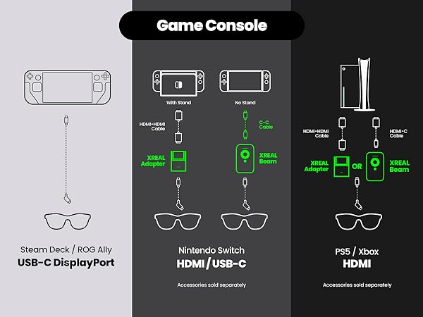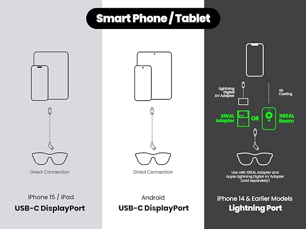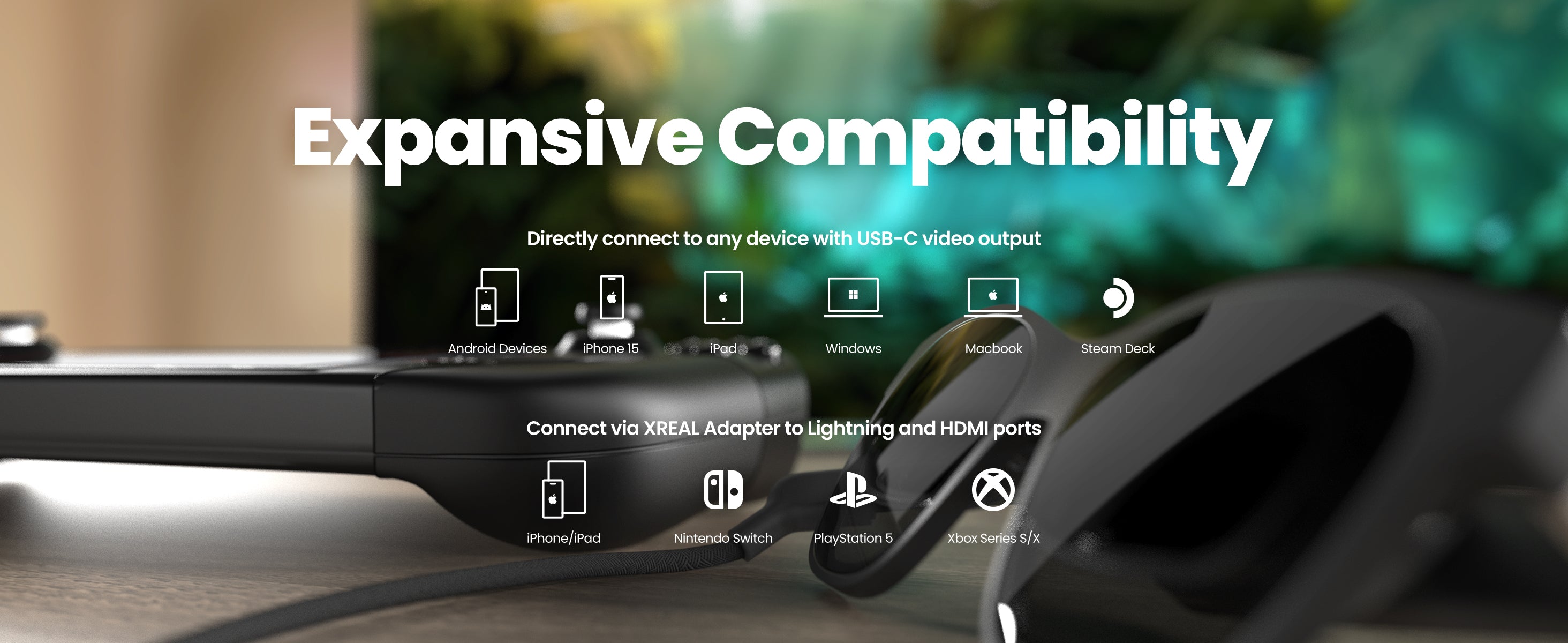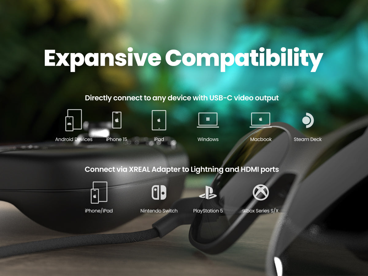XREAL Air 2 peut se connecter à presque tout, que ce soit votre téléphone, votre ordinateur personnel ou votre console de jeu. Les exigences de compatibilité varient en fonction du type d'expérience qui vous intéresse. Vous pouvez trouver des informations de compatibilité à la fin de chaque page Expérience. N'oubliez pas d'utiliser uniquement les câbles officiels de XREAL pour la connexion filaire.